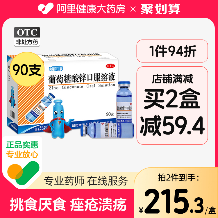 天猫阿里健康大药房,【自营】【三精】葡萄糖酸锌口服溶液0.35%*10ml*12支/盒口腔溃疡异食癖痤疮厌食症营养不良,药师服务 90支实惠礼盒装
